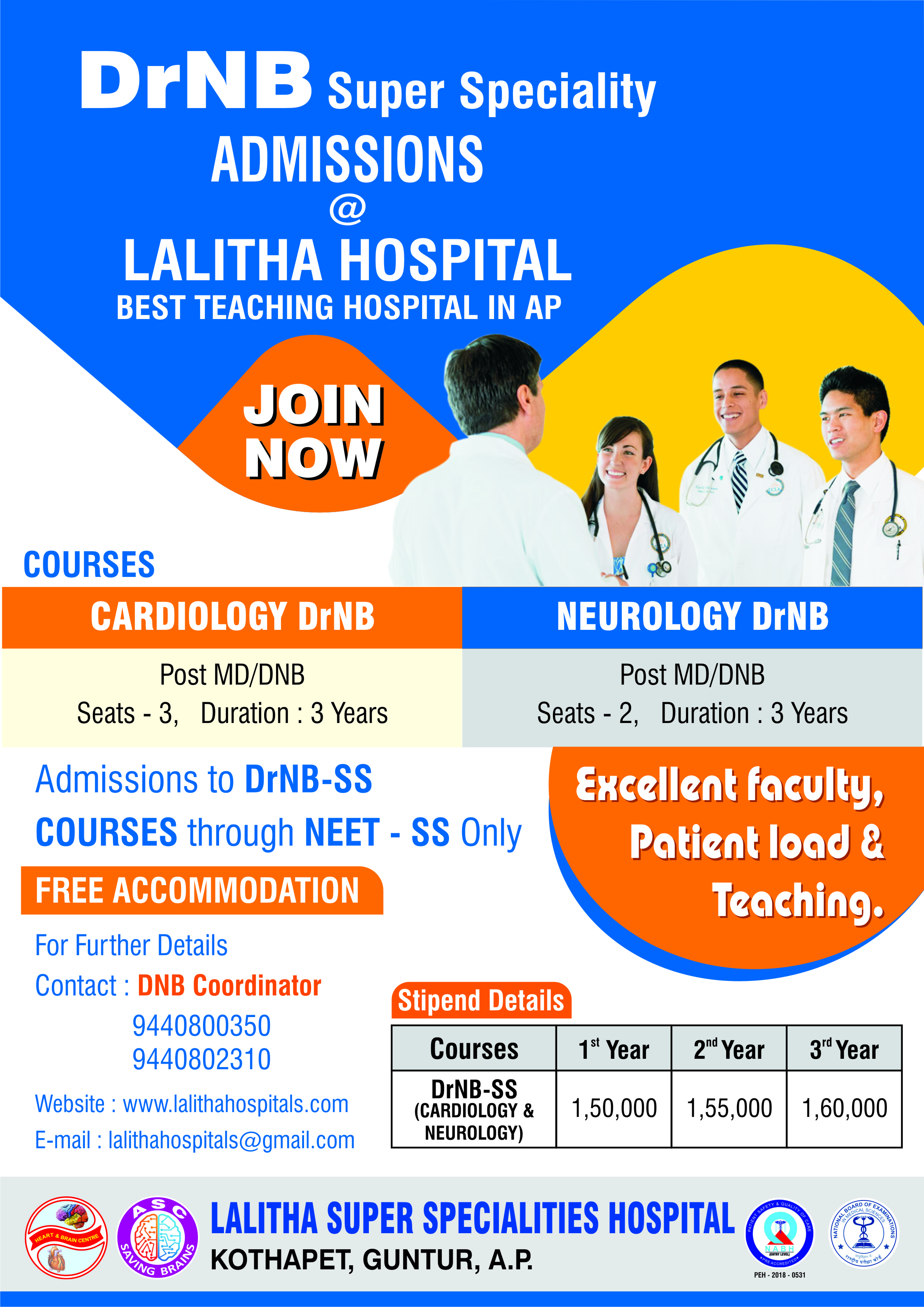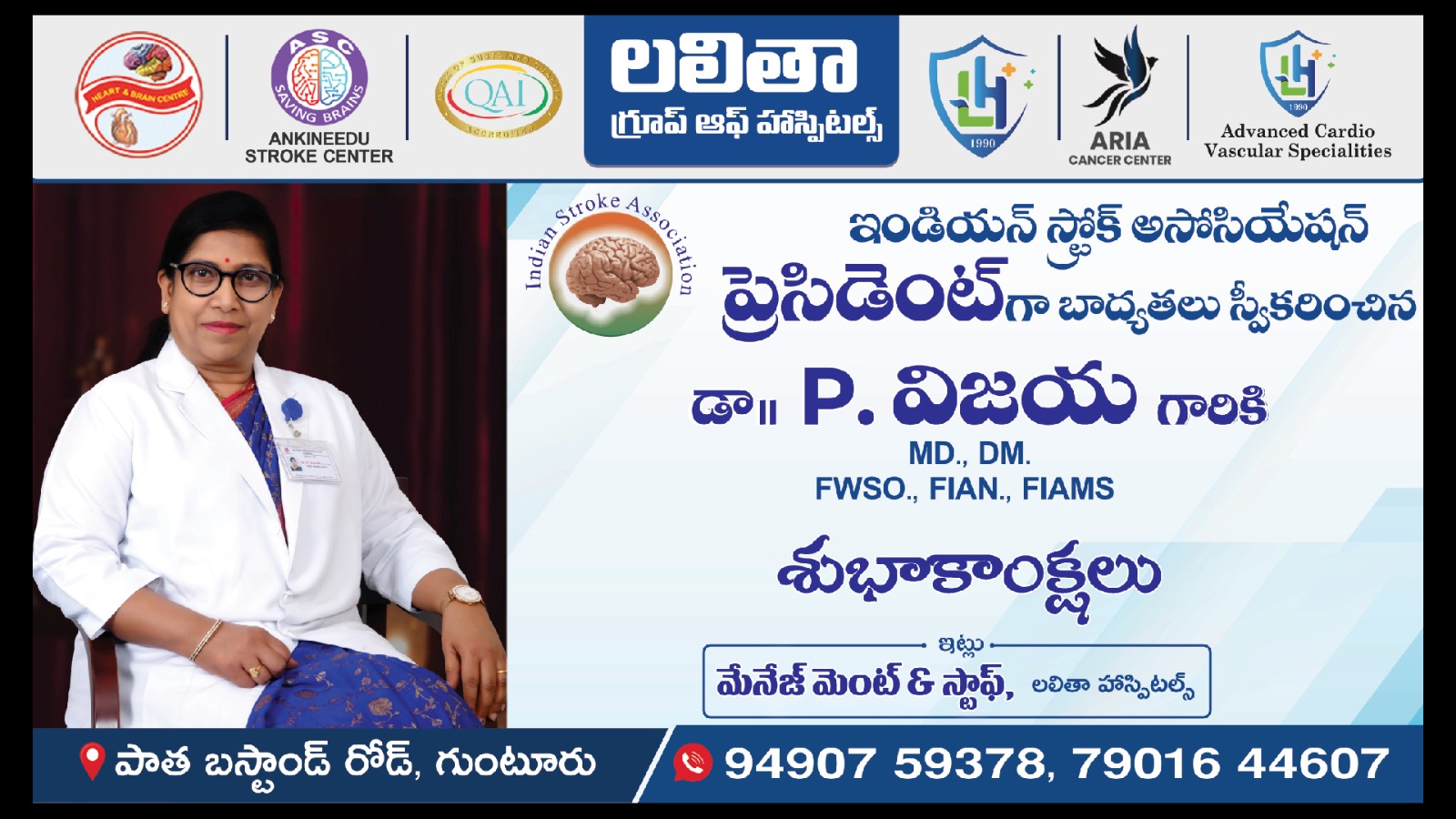 The hospital was started on 9th November, 1990 by Dr. P.V.RAGHAVA SARMA M.D., D.M., (PGIMER, Chandigarh), Cardiologist and Dr. P.Vijaya, M.D., D.M (PGIMER, Chandigarh), Neurologist in the name of LALITHA HOSPITAL, HEART & BRAIN CENTER. Since then it has developed into a reputed and unique center for Cardiology, Neurology and also added medical and surgical specialties under one roof providing advanced medical care facilities. It is managed by 800+ strong committed staff including highly qualified full time medical specialists, experienced nursing staff, efficient technicians, trained paramedical staff, Physical therapists, social workers and fully computerized administrative department working towards the comprehensive care of patients.