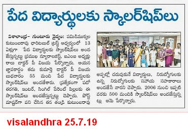 Dr. P.V. Raghava Sarma M.D., D.M., & Dr. P. Vijaya M.D., D.M., started “Kutumba Rao Charitable Trust” in the name of her Late Father as “Pamidimukkala Kutumba Rao Charitable Trust”. Through this trust thousands of merit students received scholarships for their Education expenditure regularly from the year 2006 onwards, till now Rs. 9,77,519/- donated. And also donated (Rs. 22,55,033/- ) from Lalitha hospital to various Voluntary Service Organizations, Charitable Trusts, to Chief Minister Relief Fund, Temples, Colleges like J.K.C College, B.H. College, etc., several orphanages, Seva bharathi, etc. The Hospital also extends its services during Natural Calamities, Hud Hud Cyclone (donated Rs. 5.0 Lacks), for Guntur Medical College Equipments donated Rs. 6.0. Lacks