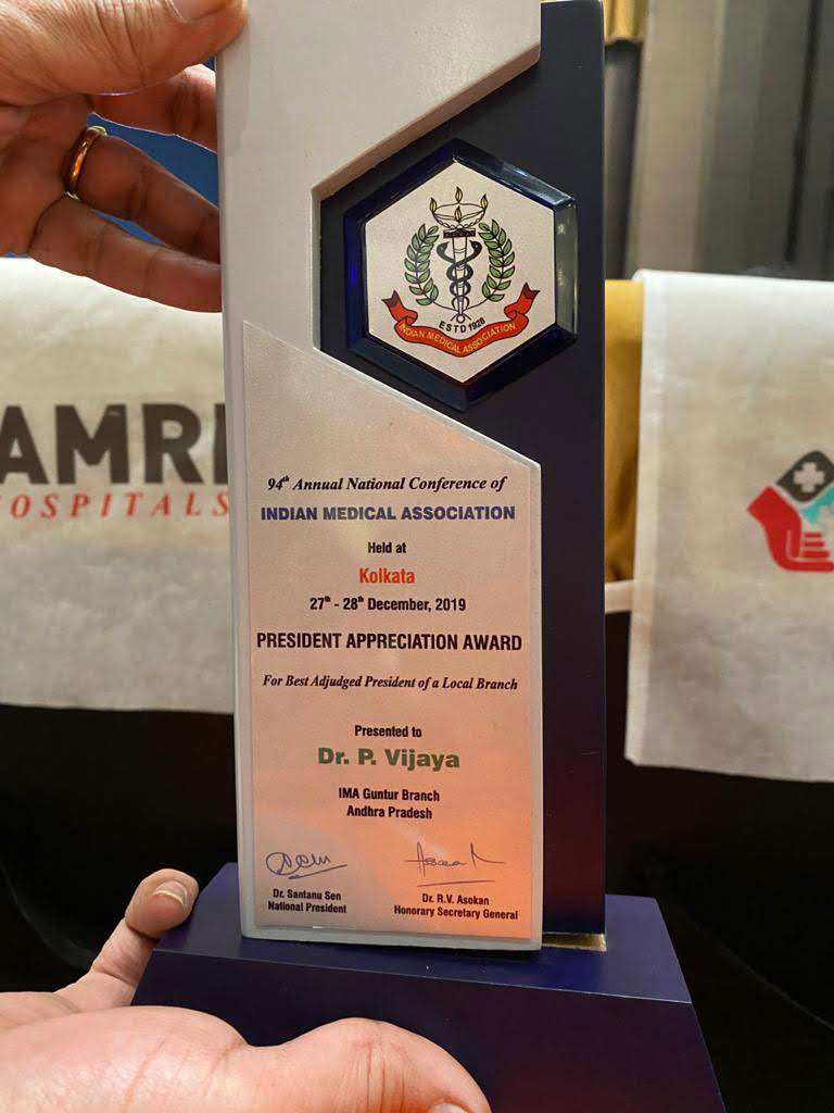 She was the President for Indian Medical Association (IMA) Guntur for the year 2018-19. Dr.Vijaya received Best president “Par excellence Award” from AP State IMA for the 2018-19 Guntur IMA activities. Also Received 2 National IMA awards - 1. National President Appreciation Award for Best adjudged President of Local Branch 2.Rotating trophy for Best overall performance by a local branch.