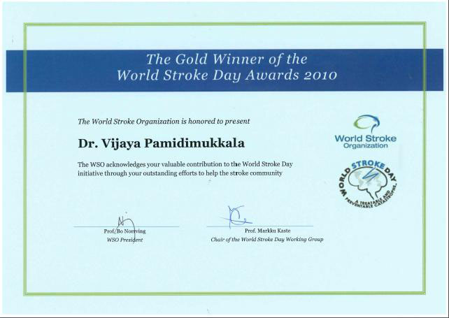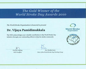 Dr.P.Vijaya achieved The Gold Winner of the World Stroke Day Awards 2010 by World Stroke Organization standing 1st place from 84 Worldwide entries.